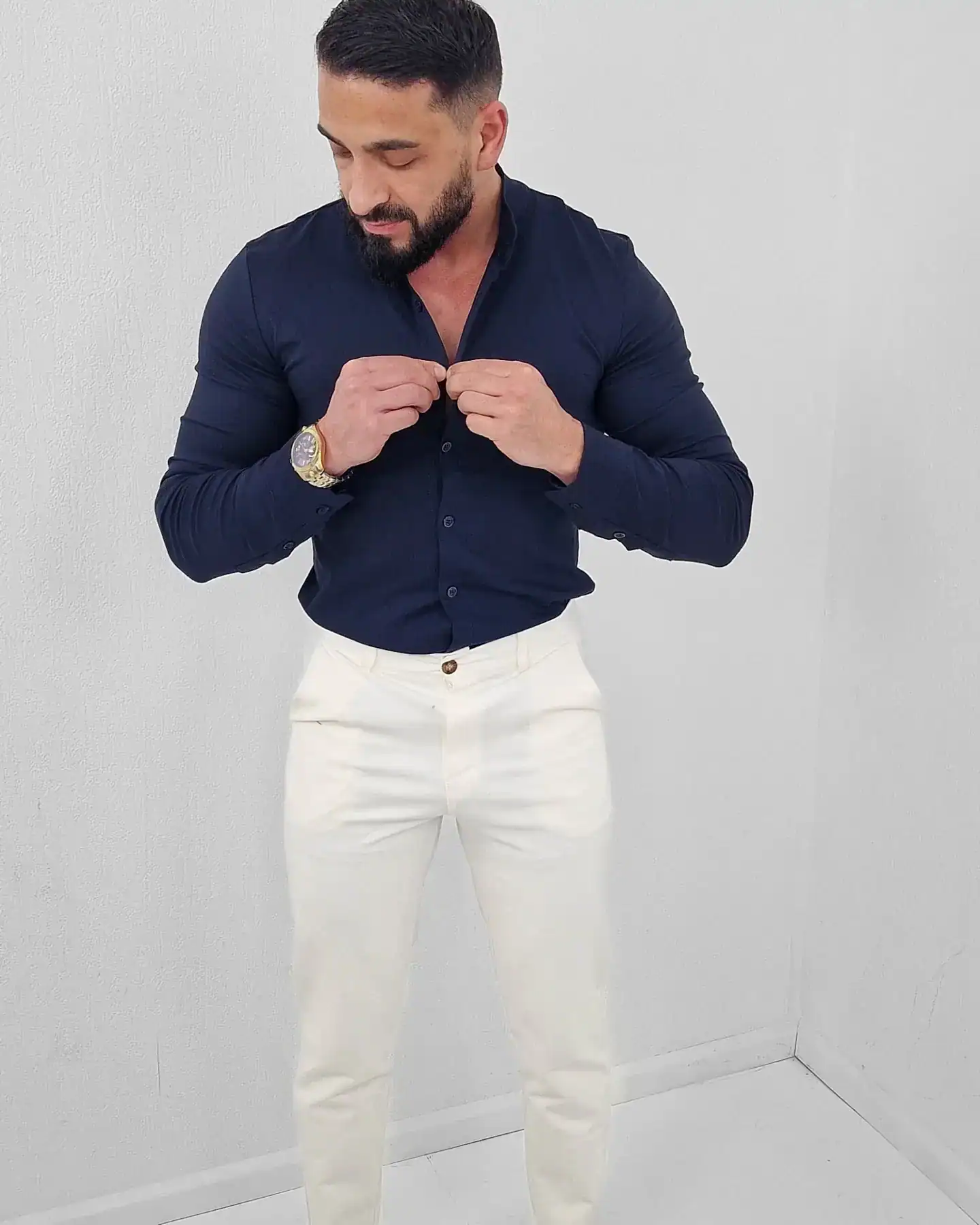 Halve Kraag Blouse Donker Blauw Slimfit Stretch