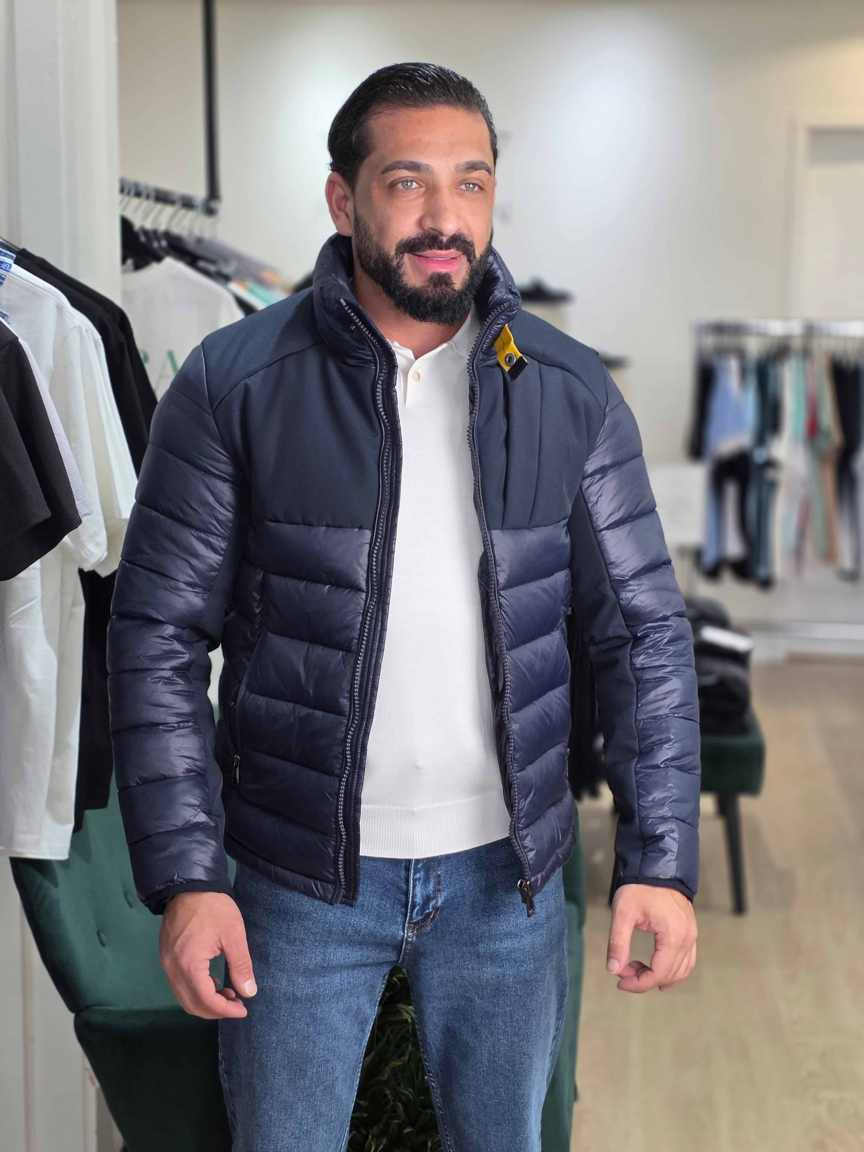 Deze stijlvolle en warme gewatteerde winterjas is ontworpen voor dagelijks comfort tijdens koude dagen. De jas heeft een strak navy-blue design, gecombineerd met horizontale padding voor optimale isolatie. De hoge kraag met een opvallend geel detail biedt extra bescherming tegen wind en kou, terwijl de twee ritszakken zorgen voor praktische opbergruimte.